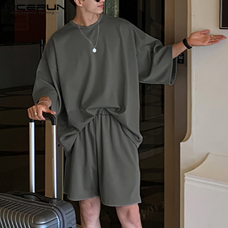 RisingHope Korea INCERUN 2PCS Mens Short Sleeve T Shirts Short Sleerwear Sets Sports Tracksuit Lounge Suit